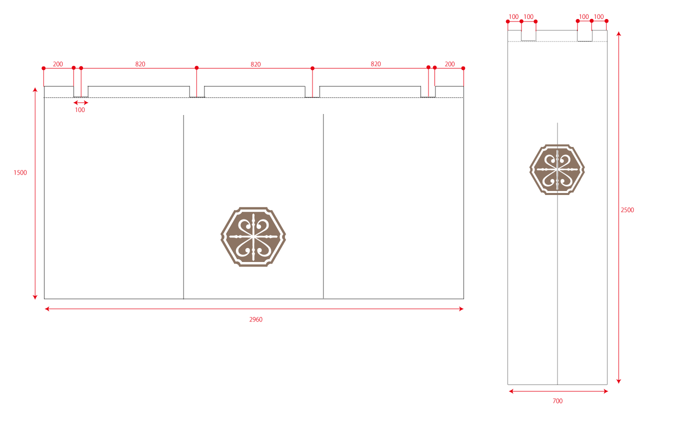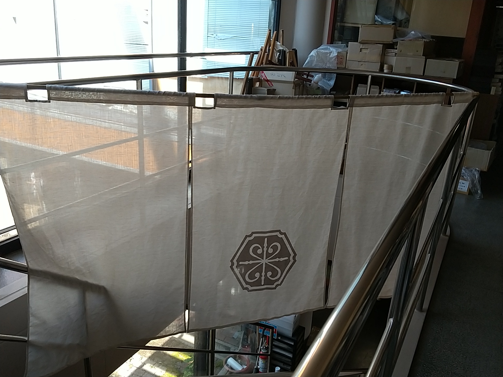 ①のれん 麻 伊平織 生成り ロゴ(プリント)W296xH150㎝ 3連 防炎加工