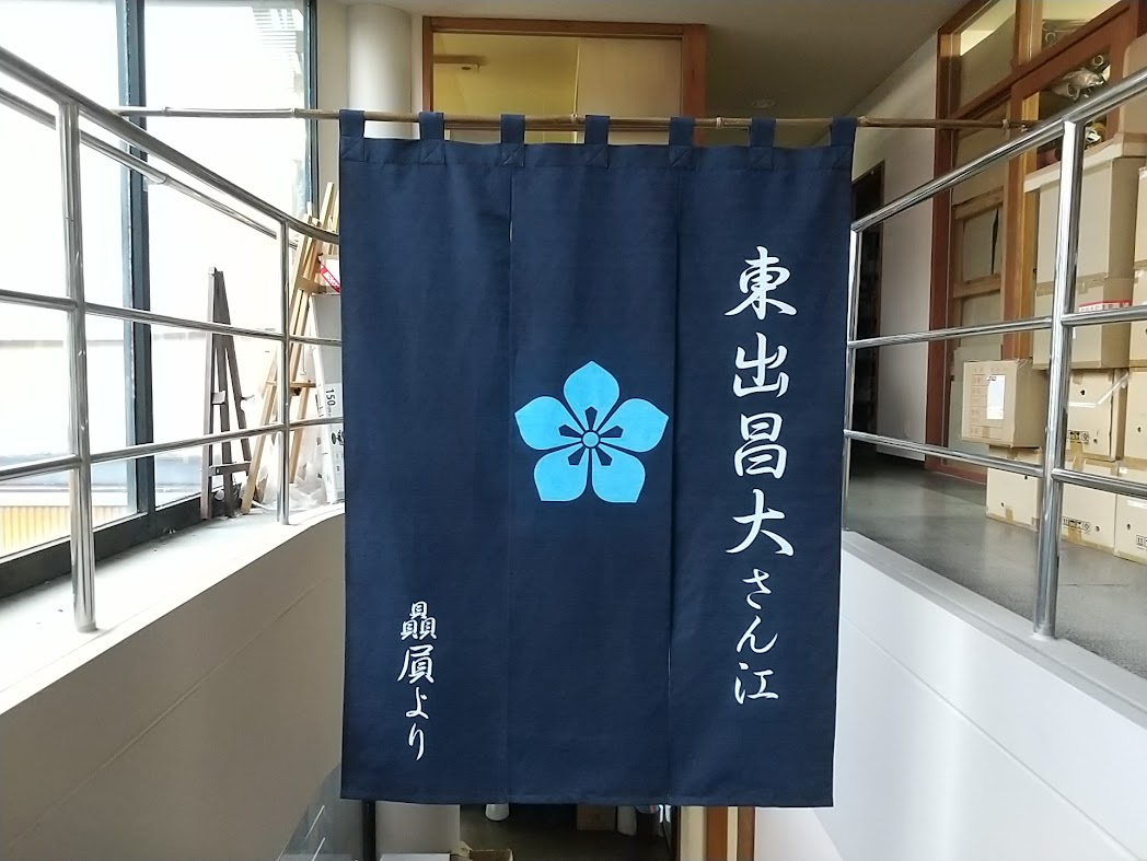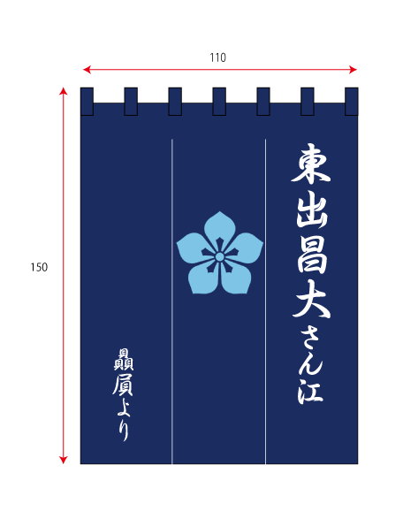 のれん絹綿 藍 デザインあり W110xH150㎝ 3連 乳付 防炎