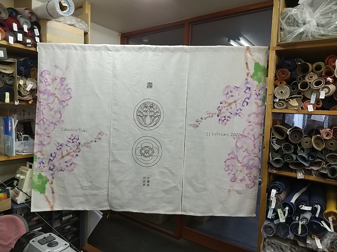 のれん 麻(伊平織) デザインあり(プリント) 生成り W180xH134cm 3連 袋縫