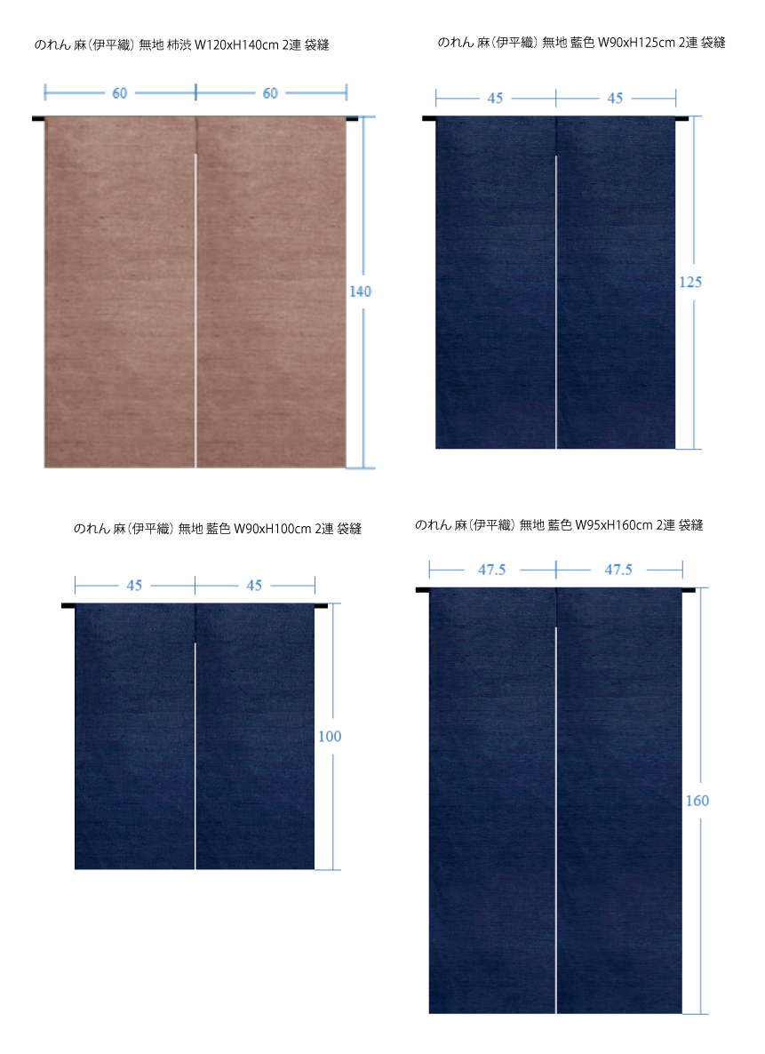 のれん 麻(伊平織) 無地 藍色 W90xH125cm 2連 袋縫